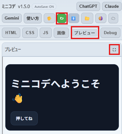 コードを書いたら、↻(更新ボタン)を押すだけで実行できます。フルスクリーン表示も可能なので、作ったアプリやゲームを大画面でチェックできます。