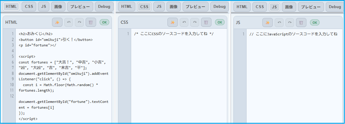 HTML・CSS・JavaScriptをタブごとに分けて書けば、見やすいソースになります。