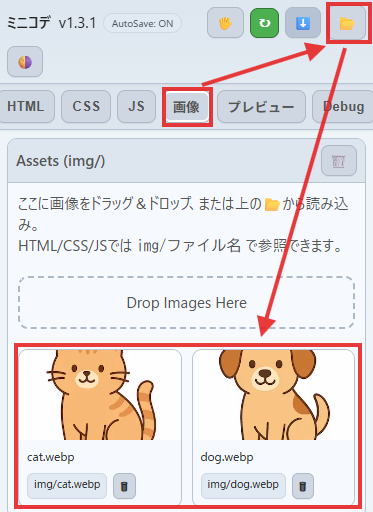 画像タブに「cat.png」「dog.png」が表示されればOKです。