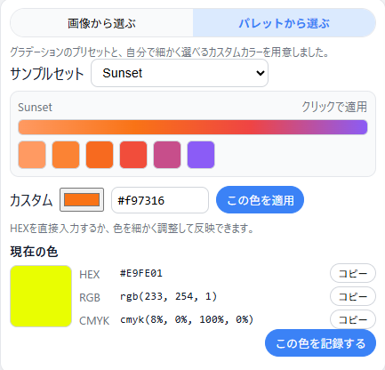 カラーコード横のコピーを押すとカラーコードをコピーしたり、「この色を記録する」を選ぶと色の履歴を残すことができます。