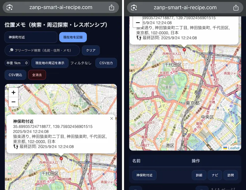 今回、開発した位置メモはこんな特長のあるWebアプリです。 現在地をワンタップで記録し、一覧・編集・CSV入出力・周辺探索ができる地図メモアプリです。 画面上には「... -