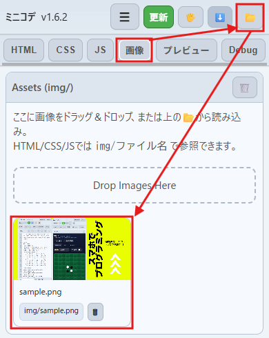 画像をセットすると、「img/ファイル名」で参照できるようになります。