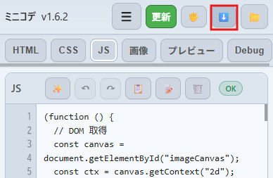 なお、自分の使っているミニコデのバージョンが古いと思った方は一度ブラウザキャッシュクリアして、読み込み直しをするか、「☁」ボタンをタップすると最新版へアップデートしてくれます。