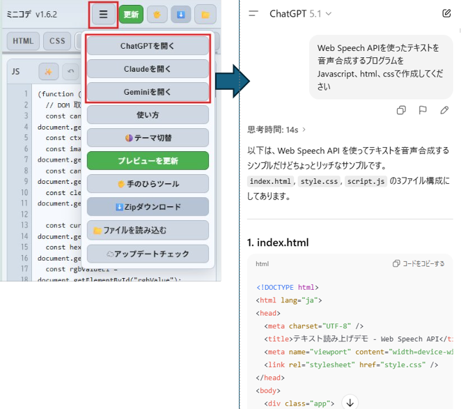 ミニコデのハンバーガーメニューからChatGPT、Claude、Geminiを呼び出すことができます。