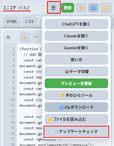 | Ver.1.6.2 | 2025/11/24 | ・プレビューの表示速度改善 ・生成AI呼び出しボタン、テーマボタン(ライト/ダークモード)、アップデート機能などをハンバーガーメニューに移動 |
